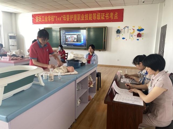 2022年6月11日上午教育部1+X母婴护理职业技能等级证书考试在安庆专业学校实训楼举行。本次考试由教育部认证的第三方机构——山东阳光大姐服务有限公司考评站与工业学校共同负责实施,圆满完成了 36名学前教育专业在校学生的考证工作。考务安排井然有序,得到了考评领导和专家的一致好评。