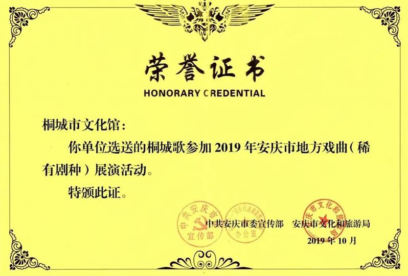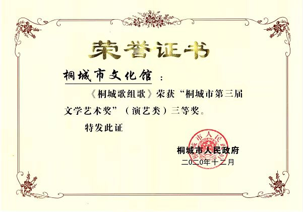 市文化馆携手中华职校开展丰富的“桐城歌”传承传习活动,组织业务人员对学生们的声腔、方言、舞蹈动作进行专业系统培训,演绎富有乡土气息的桐城歌音乐作品《桐城歌组歌》。201910月作品入选参加由中共安庆市委宣传部、安庆市文化和旅游局举办的2019年安庆市地方戏曲(稀有剧种)展演活动,获得一致好评;202012月作品获桐城市人民政府颁发的“第三届文学艺术奖”(演艺类)三等奖。