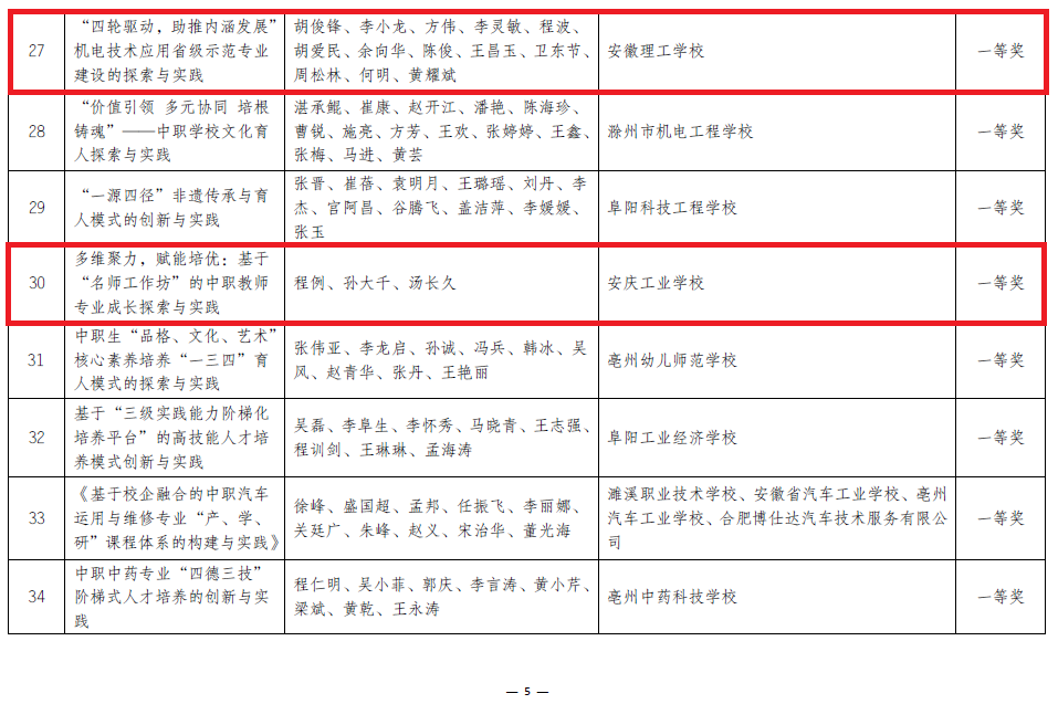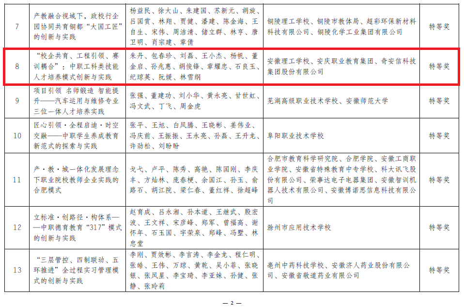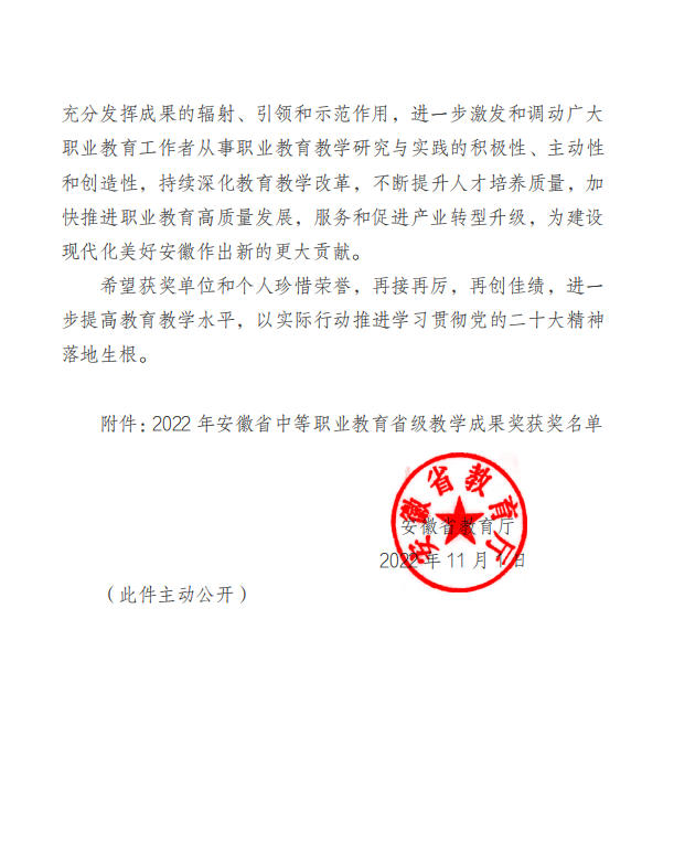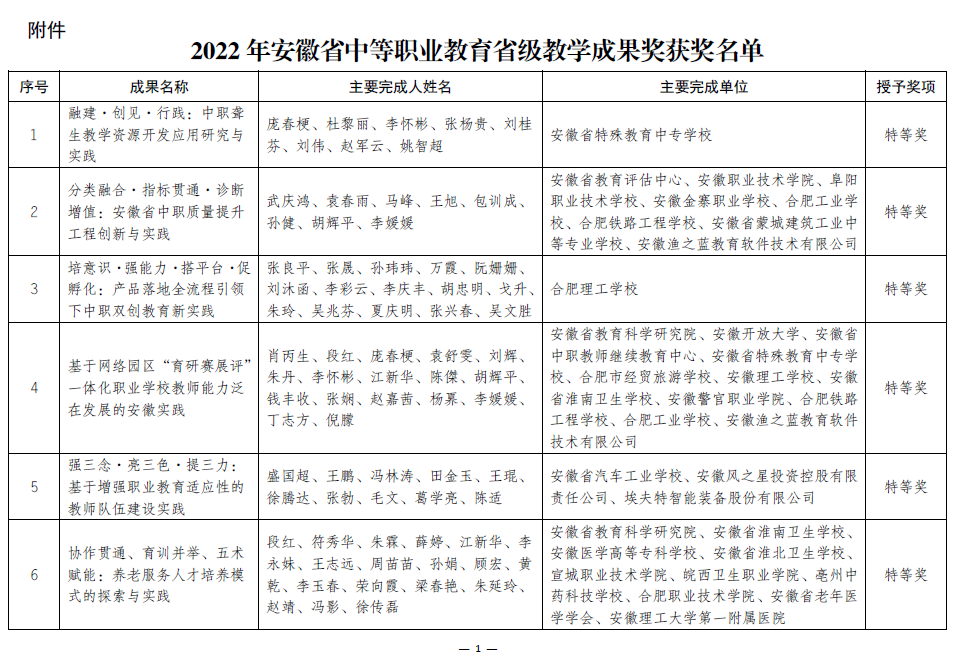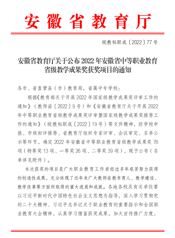 近日,安徽省教育厅公布了标志着全省中等职业教育教学最高水平的2022年安徽省教学成果奖评选结果。根据安徽省教育厅下发的《安徽省教育厅关于公布 2022 年安徽省中等职业教育省级教学成果奖获奖项目的通知》(皖教秘职成〔2022〕77 号)文件,安徽理工学校报送的两项教学成果分别获得特等奖、一等奖,安庆工业学校报送的教学成果获得一等奖。