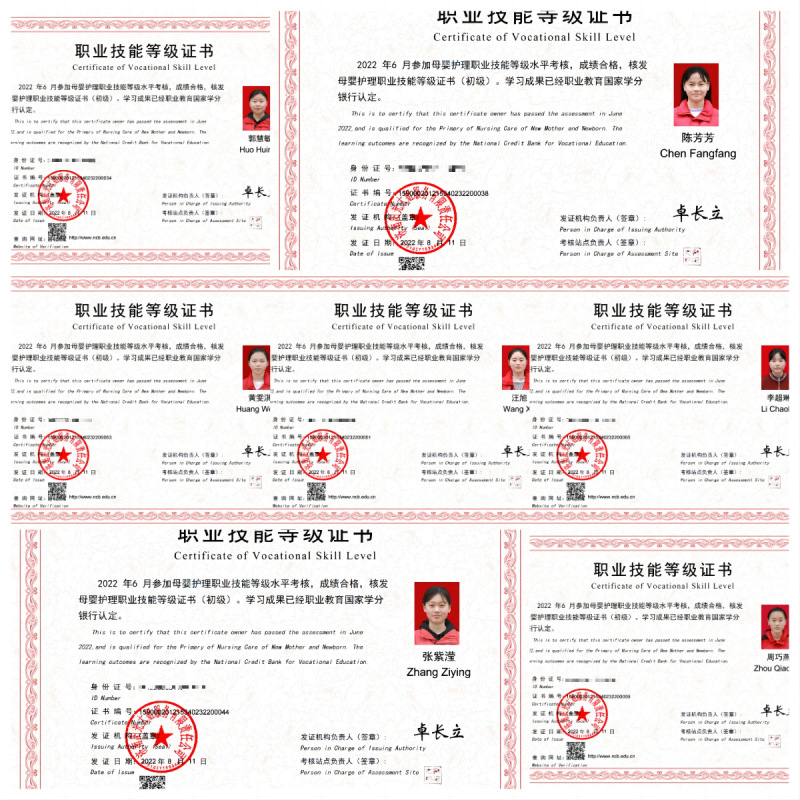 为贯彻国家职业教育改革政策,该校积极申报“1+X”母婴护理职业技能等级证书试点项目,先后选派多名教师参加师资和考评员培训,不断推进“1”和“X”有机衔接。2022年该校圆满完成了1+X母婴护理职业技能等级证书考试工作。36名学前教育专业在校学生参加考试,在师生共同努力下,该校考生理论考试和实操考试通过率皆达到100%。