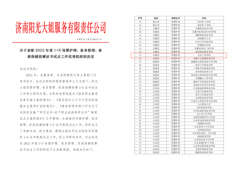 近日,安庆工业学校被教育部培训评价组织单位授予2022年度‘1+X’制度试点工作母婴护理职业技能等级证书“优秀试点院校”荣誉称号。
