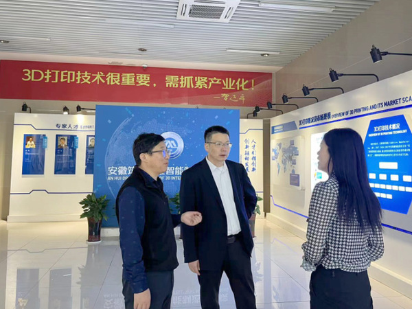 在安徽筑梦三维智能制造研究院,一行四人参观了企业展厅,了解了该研究院发展历程、核心技术以及目前发展的强劲势头。