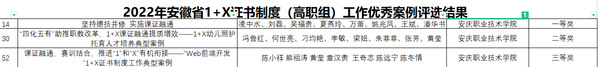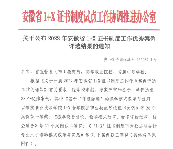 5月18日,安徽省1+X证书制度试点工作协调推进办公室公布了2022年安徽省1+X证书制度工作优秀案例评选结果,安庆职业技术学院在此次评选中喜获佳绩,荣获一等奖1项、二等奖1项、三等奖1项。
