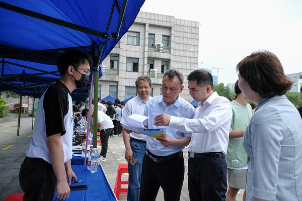 校党委书记童宏葵、党委副书记李克让、安庆市人力资源和社会保障局副局长方敏、市公共就业创业服务中心主任王中群,到双选会现场指导,了解学生们的求职意向和企业的用工需求。