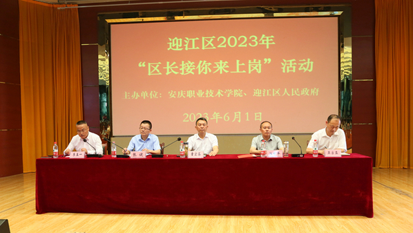 就本次活动,童宏葵用了“五个够”进行了概括。一是活动品牌“够响的”。这个活动的主题原本是“区长喊你来上岗”,区长把“喊”改为“接”,一字之改,体现了“四高”:政治站位高,是尊重技能型人才、重视职业教育的诚意体现;文字水平高,“接你”二字把区长内心对人才的渴望、尊重和诚意表达的淋漓尽致;人才地位高,目前学校2023届毕业生就业率已达到70%,超过全省高职院校平均水平;办学质量高,说明学校毕业生素质高,干得好,企业抢着要,区长很满意。去年的此项活动还受到《中国日报》等主流媒体的报道。二是学校工作“够拼的”。学校始终秉持市属高校这一基本属性,最大限度地为本地企业输送高质量的技术技能人才,工作中我们做到了“专业跟着产业走、教学追着企业跑、教师围着学生转、工作对着指标干、服务随着政策调”,本地就业率实现了逐年提高。三是学校实力“够强的”。今年以来,学校又取得一系列标志性成果,首批国家级职业教育教师教学创新团队通过验收;斩获金砖国家技能发展与技术创新大赛全国一等奖;“定向人才培养培训项目”和“就业实习基地项目”就业育人项目获得教育部立项;获批安徽省“三教”改革示范校等等。四是安庆市“够美的”。安庆又名宜城,宜城就是宜居、宜业、宜家的寓意。所谓宜居,就是安庆位于长江之滨,气候宜人,风景秀美,交通便利;所谓宜业,就是指安庆作为安徽省重要的石油化工、汽车零部件制造和纺织加工业基地,被省列为皖江开发的重点开放城市之一,2016年5月又被列入长三角城市群,社会经济事业有了突飞猛进的发展,潜力巨大,商机无限;所谓宜家,就是这里人文荟萃,底蕴深厚,房价不高,工资不低。正所谓才到安庆更有戏!五是迎江区“够棒的”。迎江区是安庆市城市建设“东进”主战场,也是安庆市跨江联动战略的承接地,是安庆未来发展的着力点、新增点、闪光点和兴奋点。上个月在市双招双引“三看三比”第一季度巡回检查总结点评会上,迎江区顺利实现“开门红”。不仅“红榜有名”,而且“榜榜有名”。迎江区的秦潭湖装备制造园、新能源配套产业园等园区,展现了迎江雄厚的企业风采,打造了“迎江品牌”;衡川公司锂离子电池隔膜生产项目3月份在迎江开工,总投资110亿元,实现了迎江区百亿级工业项目“零”的突破,为安庆市新能源汽车千亿产业,贡献了“迎江力量”;这个项目推进速度快,从签约到开工仅用时89天,彰显了“迎江速度”。我们和迎江区是连环体,迎江的快速发展,将对技能型人才的需求与日俱增,也为同学们提供了优质多多的就业岗位。