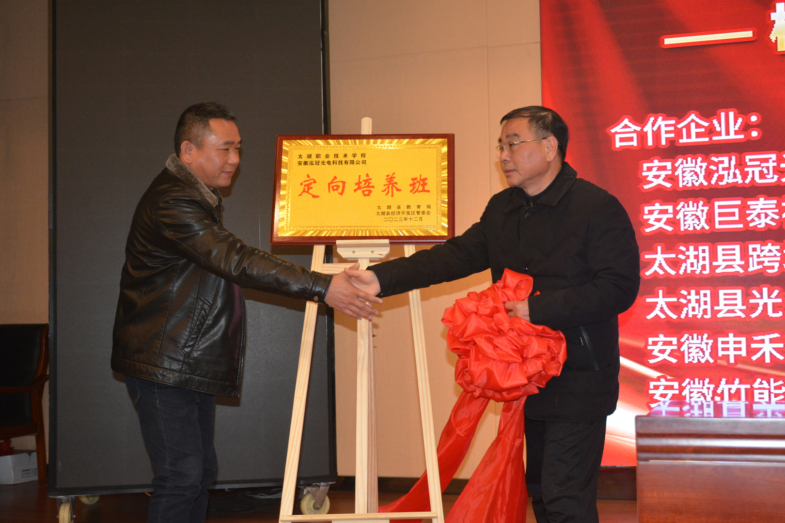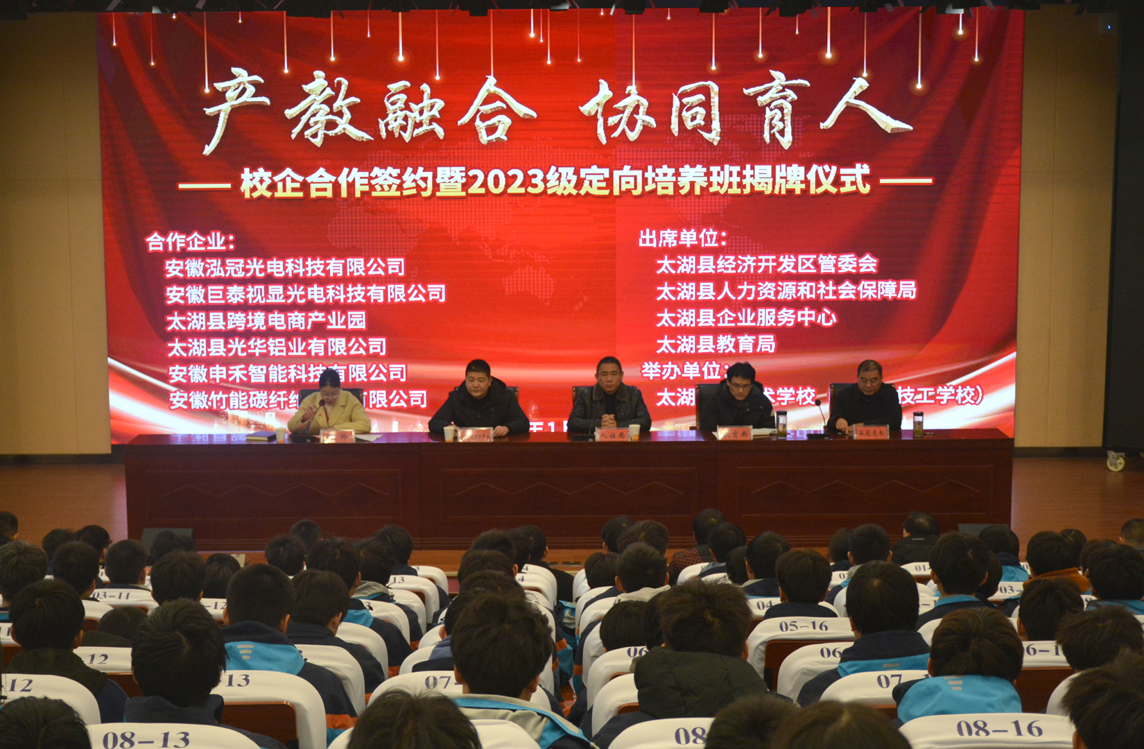1月10日,太湖职业技术学校在学校致公楼一楼多功能厅隆重举行校企合作签约暨2023级“企业定向培养班”揭牌仪式。安徽泓冠光电科技有限公司、安徽巨泰视显光电科技有限公司、安徽申禾智能科技有限公司、太湖县跨境电商产业园、太湖县光华铝业有限公司、安徽竹能碳纤维材料有限公司等六家企业分别与学校成功签订校企合作协议,太湖县人社局、太湖县企业服务中心、太湖县教育局等相关部门领导受邀出席,并与六家企业代表共同为“企业定向培养班”揭牌。