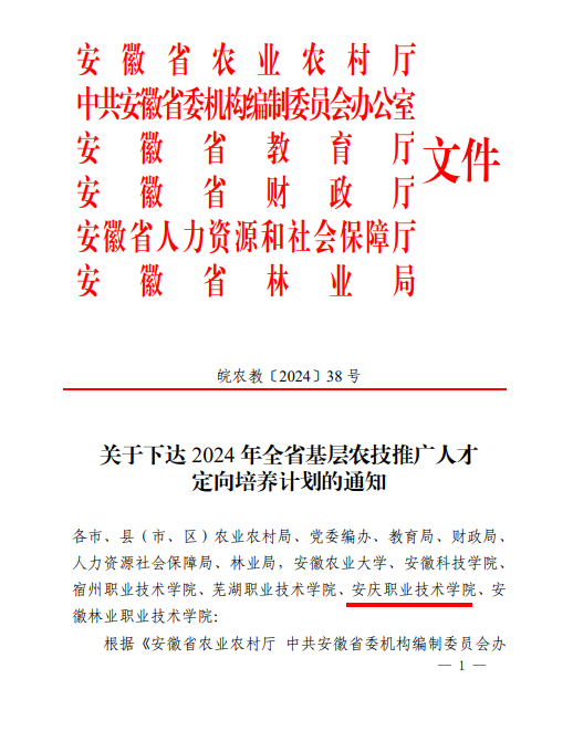 近日,安徽省农业农村厅等六部门联合印发《关于下达 2024 年全省基层农技推广人才定向培养计划的通知》,安庆职业技术学院被定为安徽省基层农技推广人才定向培养高校。