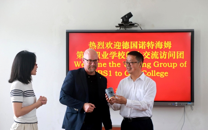 座谈会上,李海军校长对德国师生的到访表示热烈欢迎。他回顾了两校自2009年缔结友好关系以来,始终秉持开放包容、互学互鉴的精神,通过学术研讨、师生互访、技术交流等多种形式不断深化合作,已成为中德职业教育领域交流合作的一个生动缩影。他强调,在中国大力推进职业教育高质量发展、深入实施“职教出海”战略的背景下,该校高度重视国际化合作,期待双方进一步拓展在专业共建、师资培养与学生联合培养等方面的合作空间,共同为中德职教发展贡献更多务实成果。德国BBS1副校长Tammen Sven在讲话中对理工学校的热情接待表示衷心感谢,同时介绍了德国诺特海姆第一职业学校的发展近况,并提出了深化两校交流合作的积极展望。会后,双方还代表两校互赠了礼物。