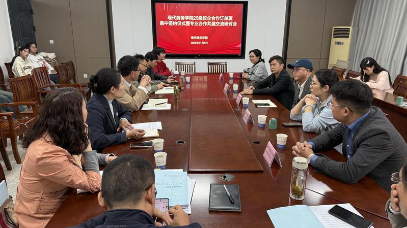 11月5日,安庆职业技术学院现代商务学院在3号教学楼510会议室举行校企合作订单班集中签约仪式,来自安庆本地的安徽云霁电子商务有限公司、安徽星虹信息技术有限公司、安徽源潭柯林沃德刷业科技有限公司、安徽际通物流有限公司、安庆和君纵达数据科技有限公司五家企业相关负责人齐聚一堂,共同签约并交流。现代商务学院院长金启胜出席仪式,该院教学工作负责人、学生工作负责人、专业负责人、订单班辅导员以及订单班学生代表参加活动。