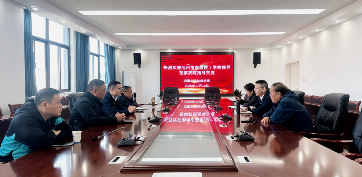2025 年 11 月 14 日上午,池州市贵池区委组织部副部长、区人才工作局副局长张兆军,贵池区人社局党组成员、副局长陈家友,池州市高级技工学校副书记(主持行政工作)倪佩文,该校培训处主任桂林、汽修专业教师钱鹏飞一行5人莅临安徽安庆技师学院,就技工教育发展开展专题交流指导。安徽安庆技师学院党委副书记、院长徐英武,党委委员、副院长徐波,党委委员张蕾热情接待并召开座谈会。