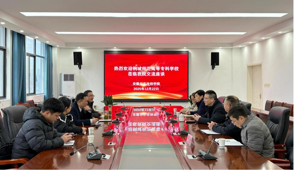 12月22日上午,桐城师范高等专科学校党委委员、小学教育系党总支书记陈涛,小学教育系主任方皓文,学前教育系副主任宋晓燕,小学教育系教学管理科长方宇一行四人到安徽安庆技师学院开展交流调研。学院党委副书记、院长徐英武,党委委员严丰俊热情接待了来访一行,学院三个系部负责人参加交流会。